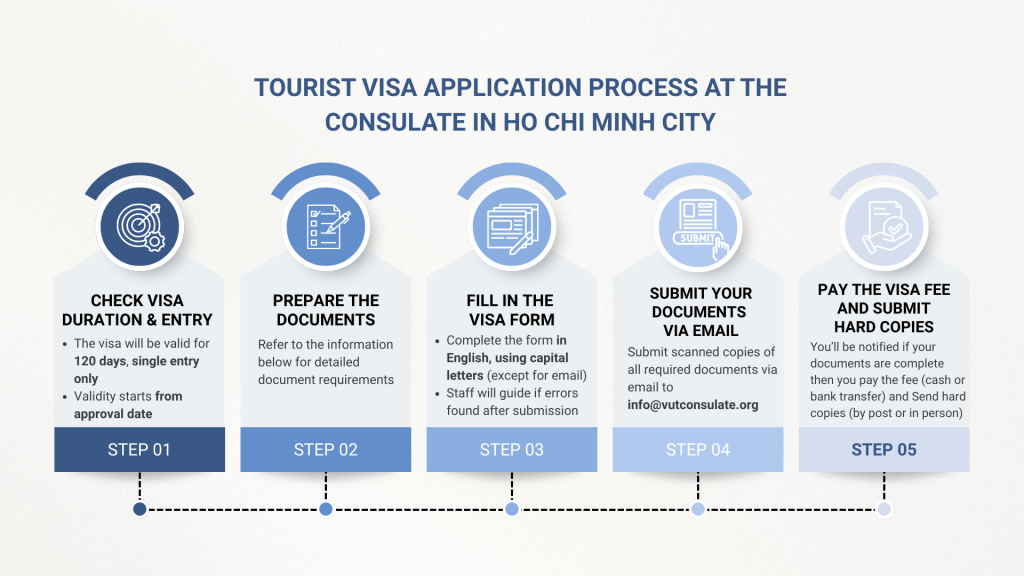+ Complete the visa application form (link: https://vutconsulate.org/tourist-visa-form/)